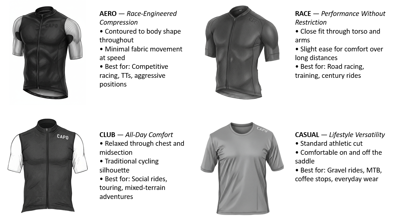 - Capo Cycling Apparel is designed for the riding position and may require some simple adjustment and positioning prior to riding.