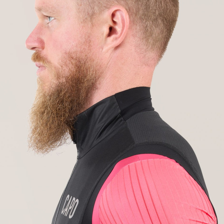 The G.S. Padrone Wind Vest is your essential, packable layer for variable conditions. Made with Italian windproof/waterproof membrane fabric, it offers lightweight protection while regulating body temperature. Its advanced anatomic fit and 4-way stretch mesh back provide ventilation and freedom of movement. Perfect for temperatures 45-65°F with a base layer, it features a two-way camlock zipper and Capo waist elastic for a sleek, gap-free fit.